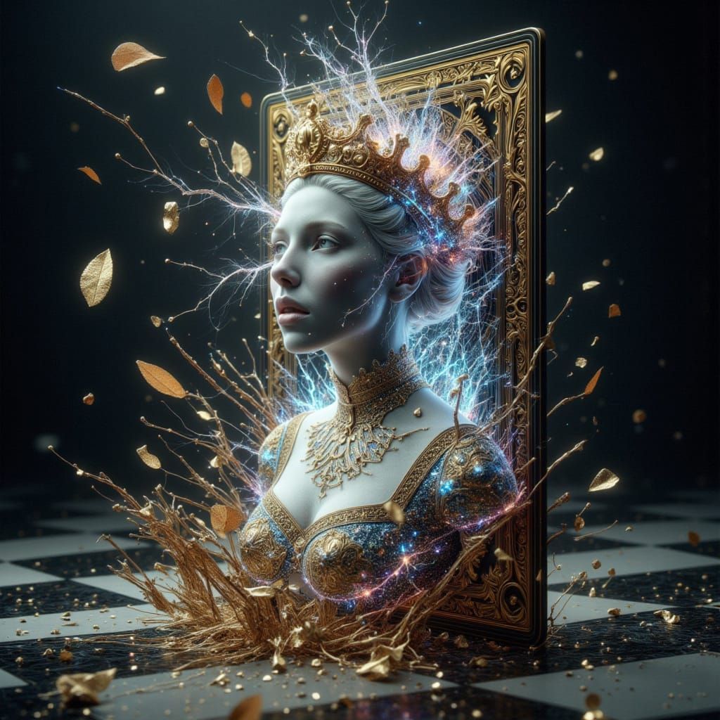 A greyscale image of a regal chess queen breaking free. The queen is surrounded by kneeling pieces, spotlit in the darkness. The digital painting has a high-fantasy aesthetic.