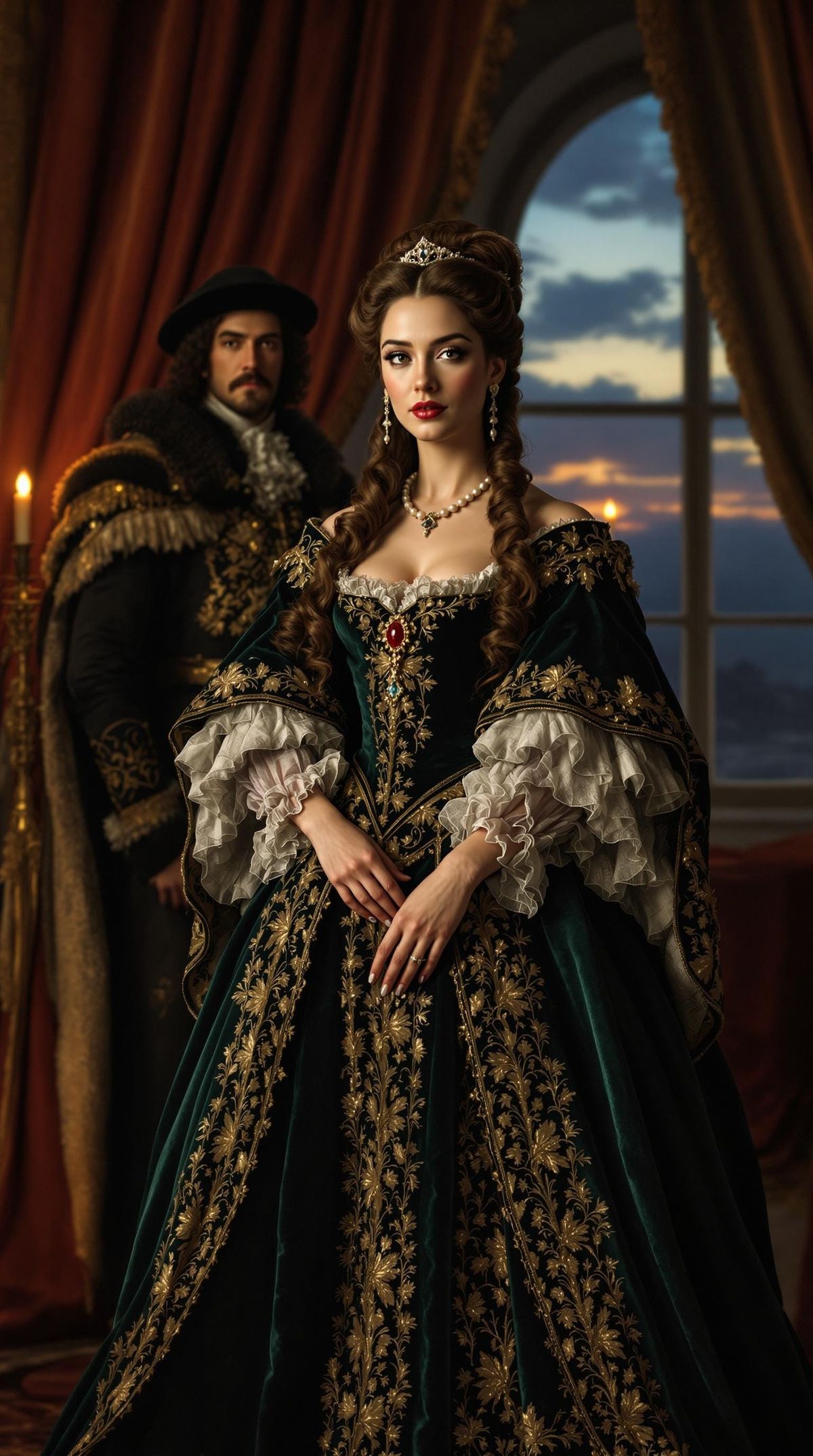 This reimagined portrait of Queen Catherine of Braganza is not only an homage to her royal station, but a visual restoration of her dignity, strength, and legacy as a Portuguese Catholic woman navigating the English court. While her historical portraits rendered her with distance or distortion, this image brings her into the lightโalive, elegant, and supported by a loyal, if imperfect, King.
