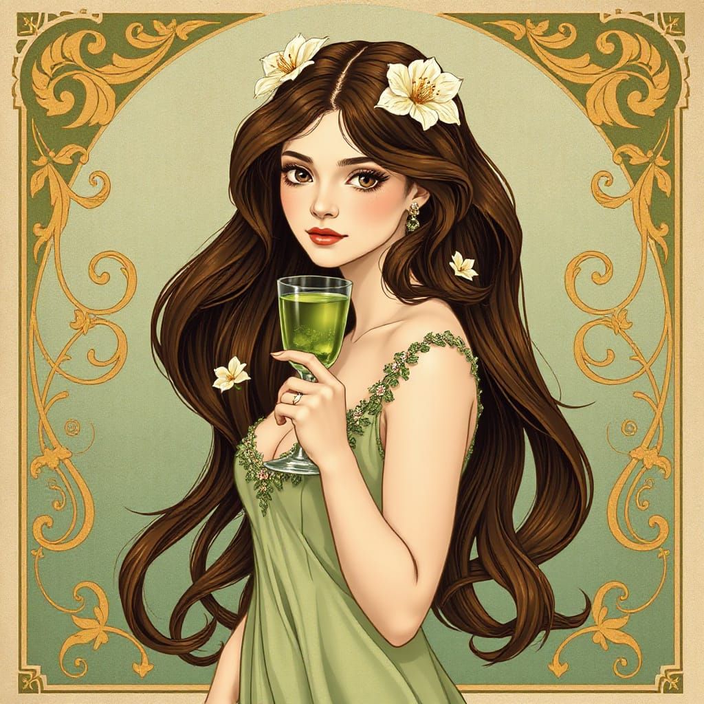 This image features an elegant woman in a vintage Art Nouveau style, wearing a pale green floral dress and holding a green drink. Soft painterly shading and delicate linework create a magical atmosphere.