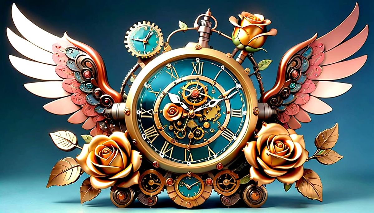 "high quality cute adorable cartoon steam-punk metallic-colored roses clock-wings flying art deco art nouveau"