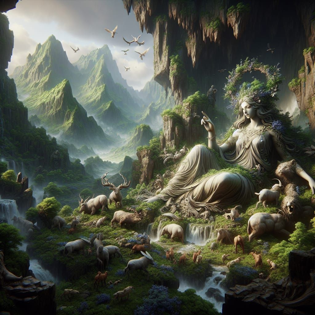 This image shows Cybele, the Greek goddess of nature, nestled in a verdant mountain range. Wild animals roam freely in this intricately detailed matte painting rendered in deep, complementary colors.