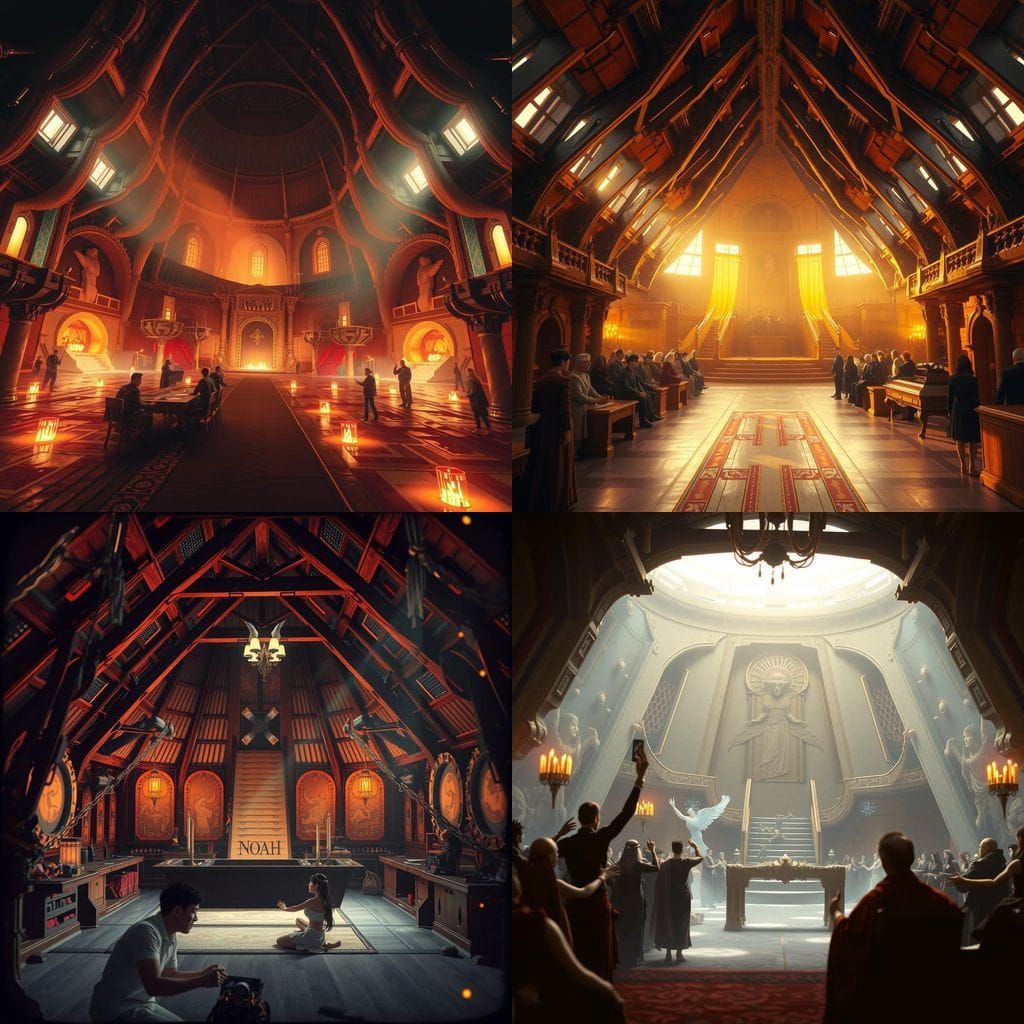 This image depicts the interior of Noah's Ark. The scene is rendered with cinematic lighting and film grain, evoking a live-action feel with post-processing and color grading in a 3D anime art style.