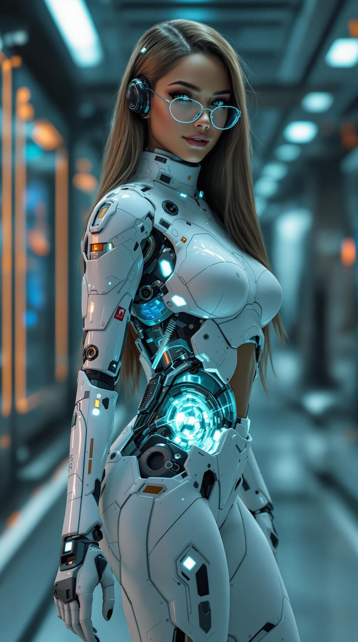 This image shows a highly detailed full-body portrait of a female cyborg in a sleek white and blue cyberpunk exosuit. The artwork is rendered with photorealistic textures and cinematic lighting.
