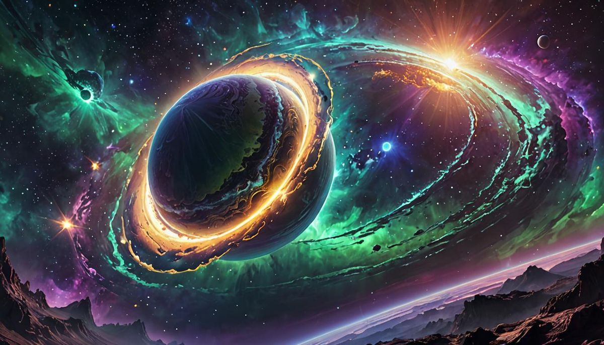 A majestic ringed world floats in space amid swirling luminescent mist and a distant nebula. This vibrant digital painting features metallic sheen, golden hour lighting, and deep purple-green gradients, rendered in a 3D cinematic style.