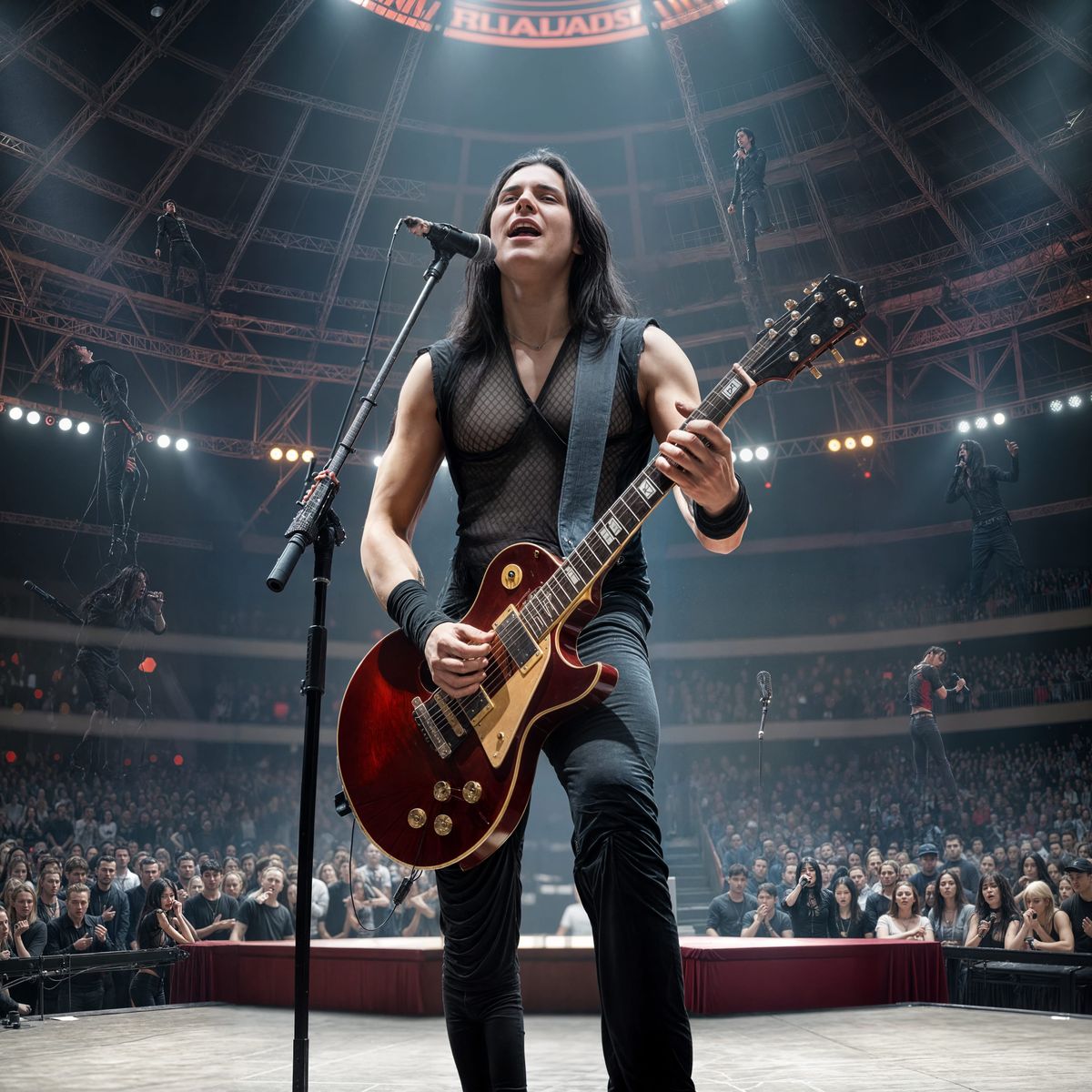 This image depicts a vampire rockstar performing on stage in the New Orleans Superdome, surrounded by adoring fans and dramatic lighting, with a style blending dark romanticism and futuristic neon noir elements.