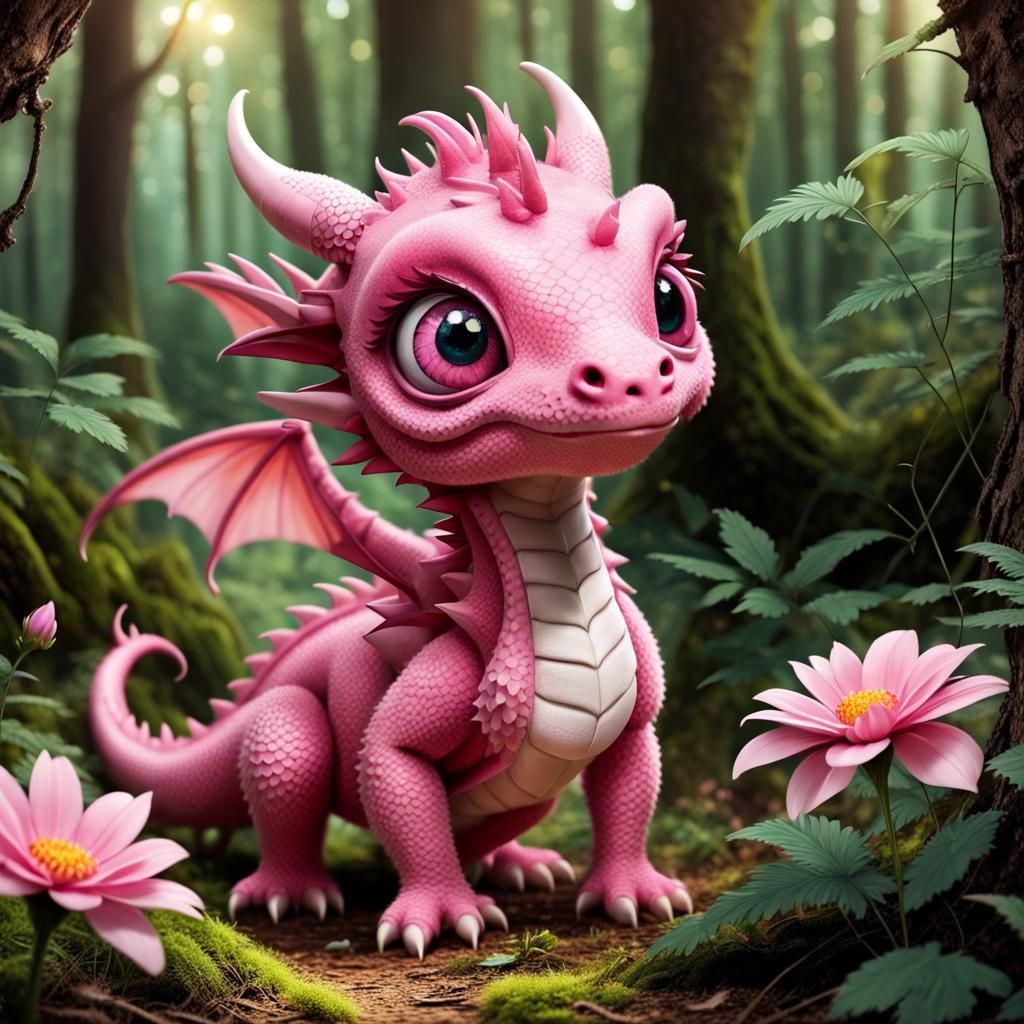 A charming image of a small pink dragon gently smelling a flower in a forest. The dragon is rendered with realistic textures, big eyes and natural lighting, giving it a cinematic quality.