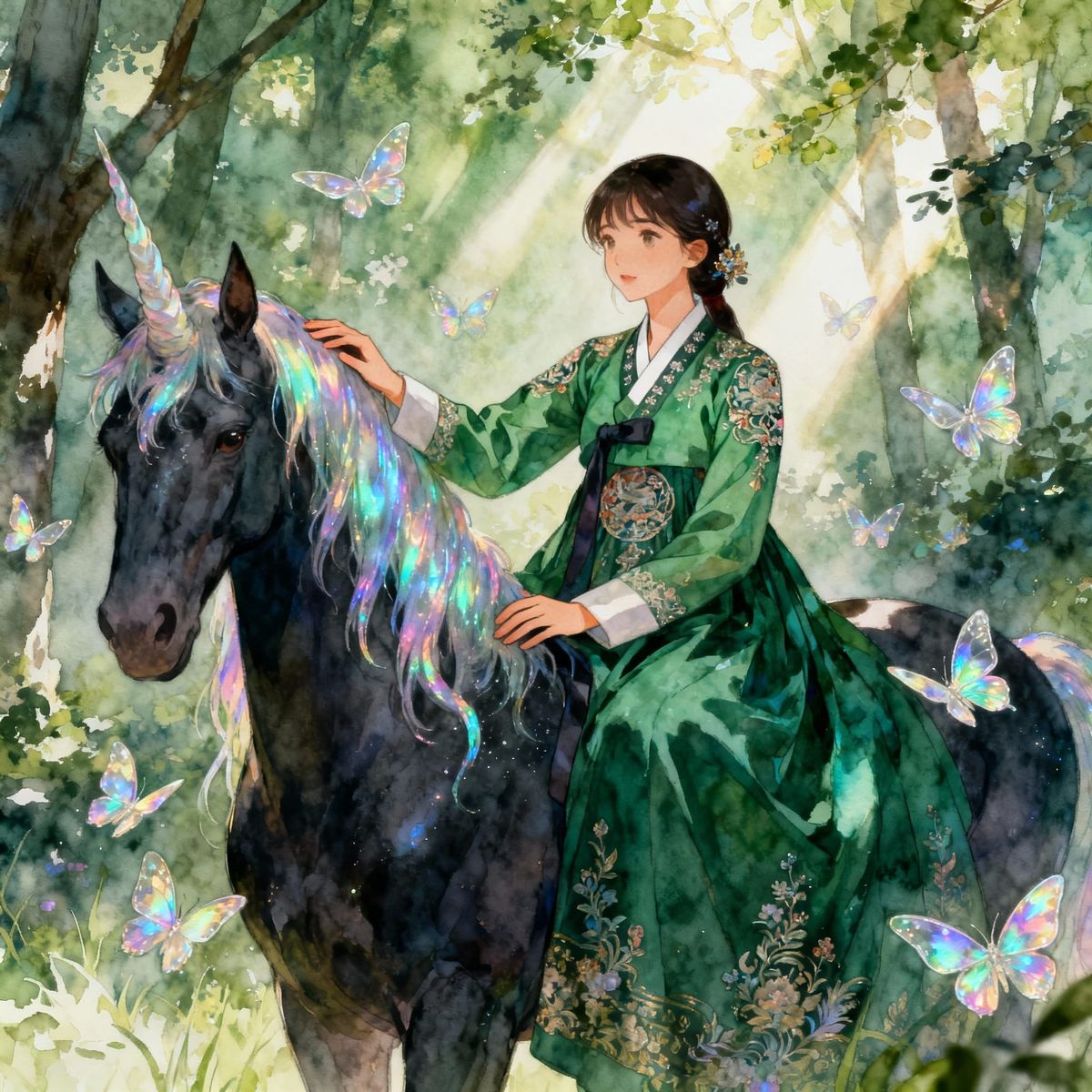 A young woman in a detailed forest-green hanbok strokes a unicorn's iridescent mane in an enchanted grove. Delicate butterflies and sunbeams create a dreamy atmosphere, rendered in a manhwa watercolor style.