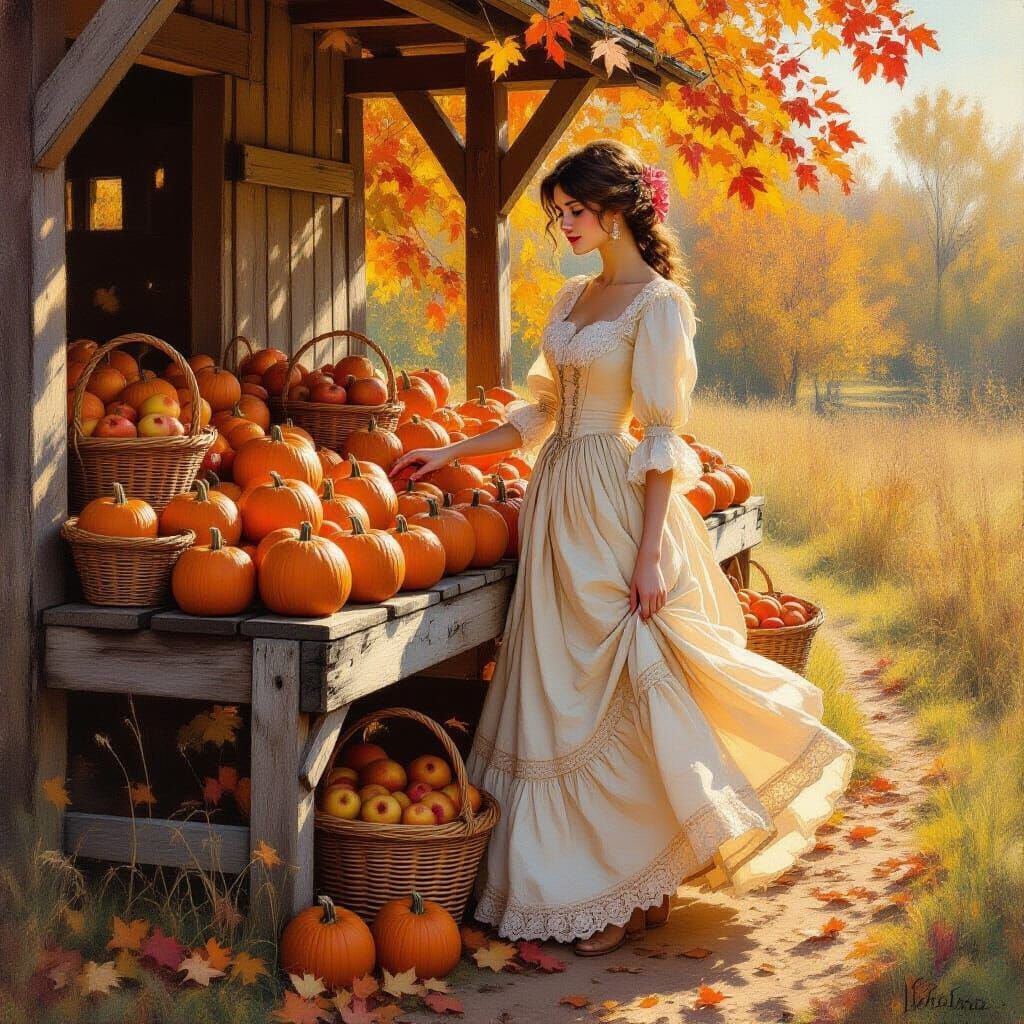 This image shows a woman in vintage dress at a farm stand filled with pumpkins and apples. The artwork is in an impressionistic style, with visible brushstrokes and warm autumn colors.