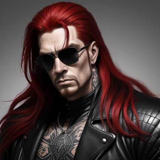 This image shows a demonic male wrestler with long red hair and tattoos, wearing silver mirrored sunglasses and a black leather outfit, set against a colorful background with a subtle gradient.