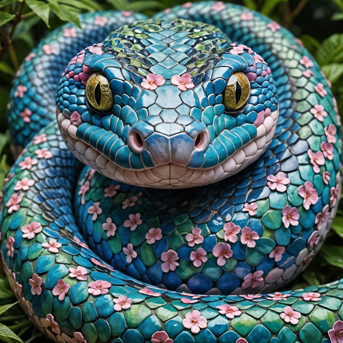 This image shows a colorful snake with mosaic scales coiled in a jungle. The snake is surrounded by exotic plants and flowers, illuminated by golden sunlight, creating a vibrant and enchanting scene.
