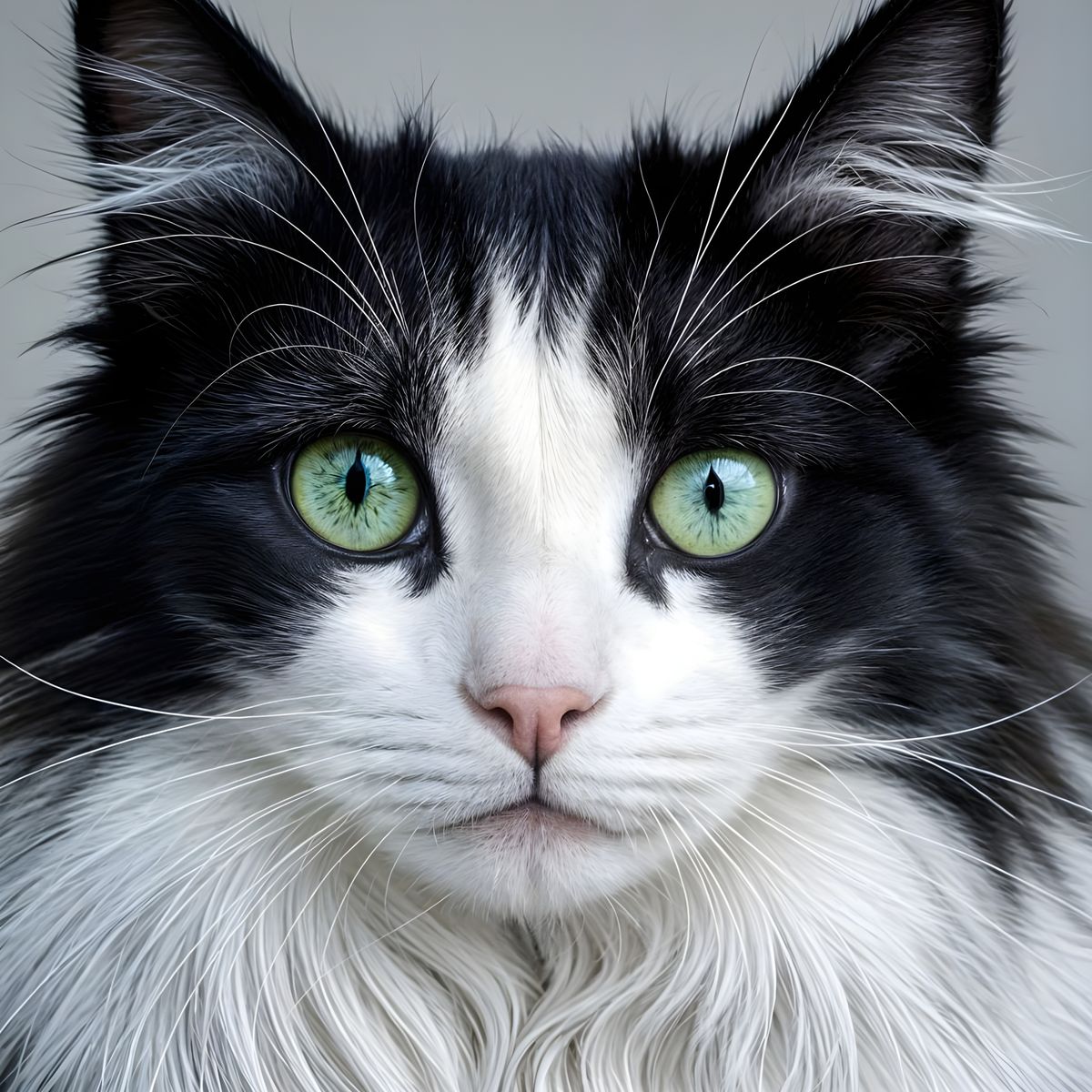 A striking picture of a black and white cat with piercing green eyes and long, flowing fur. The feline's contrasting colors create a visually appealing composition.