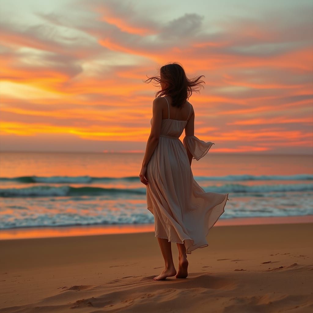 A serene image of a woman on a beach at dusk, the ocean mirroring the sky. This digital artwork blends dramatic landscapes with cinematic lighting in a surrealist style.