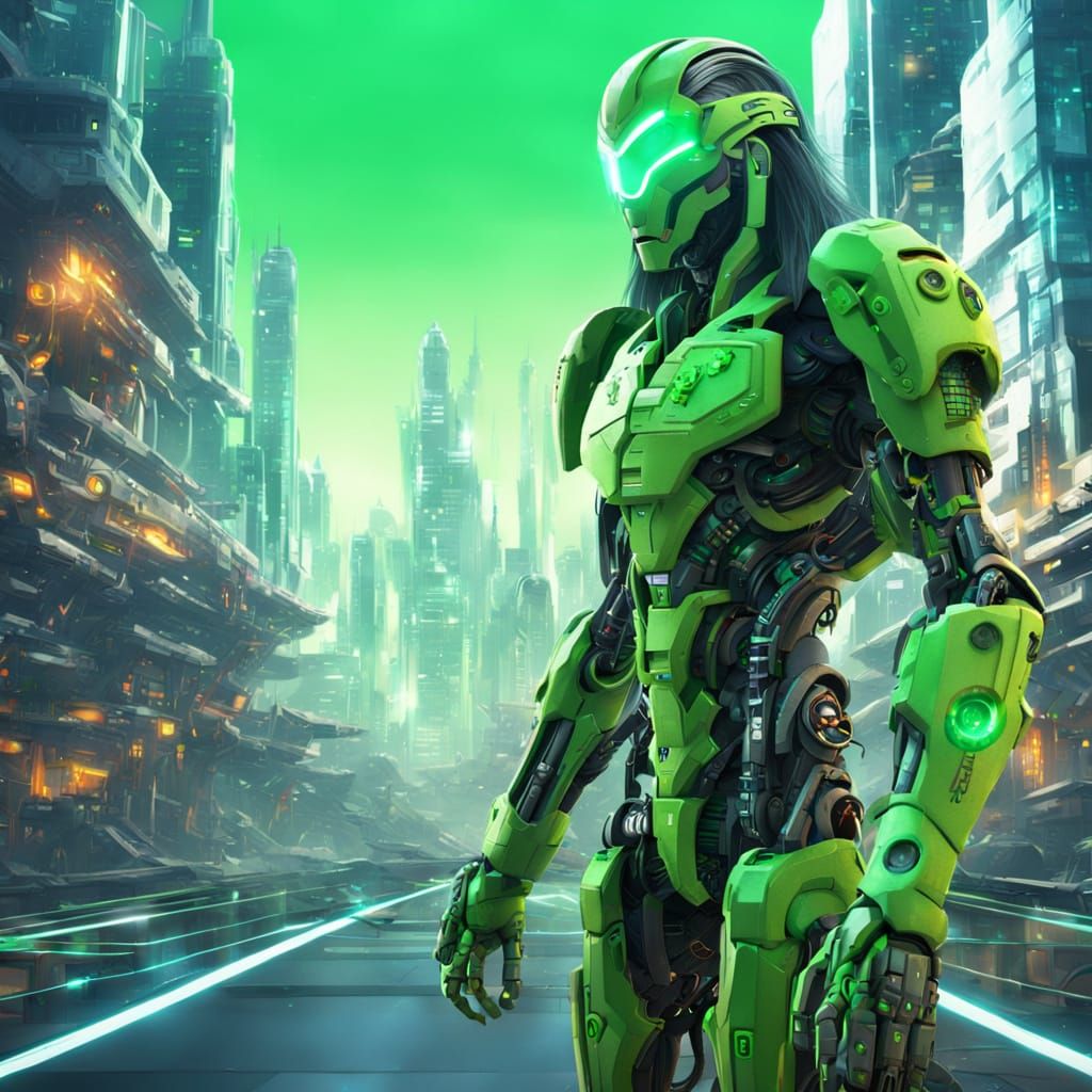 This vibrant image depicts a dynamic cyborg in a futuristic cityscape, rendered in a stylized anime aesthetic with intricate details and 3D effects.