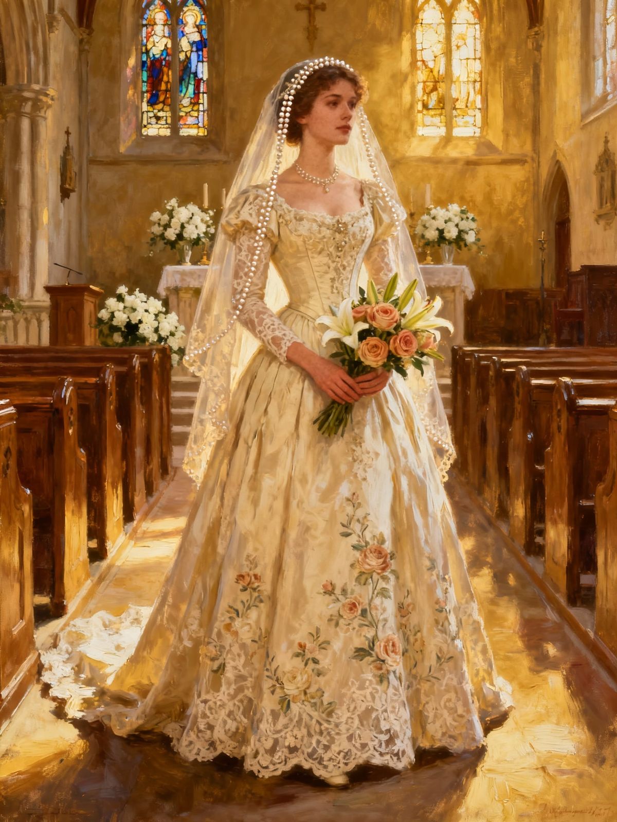 This image depicts a beautiful Victorian bride in a wedding dress inside a church. The artwork is rendered in the style of an oil on canvas painting.