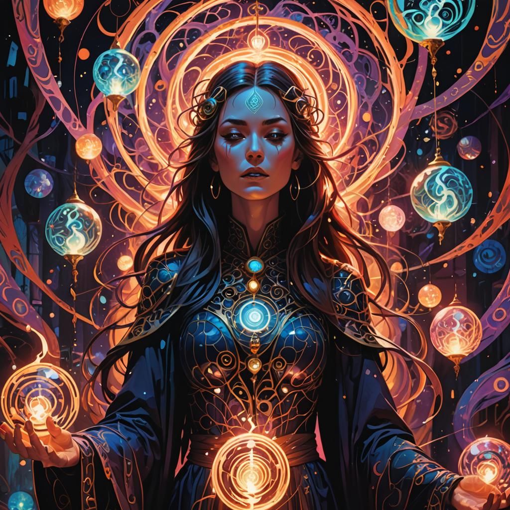 This image shows a sorceress in a psychedelic scene with swirling colors and shapes. The artwork employs vibrant colors, high contrast and a surreal atmosphere, reminiscent of abstract mystical expressions.