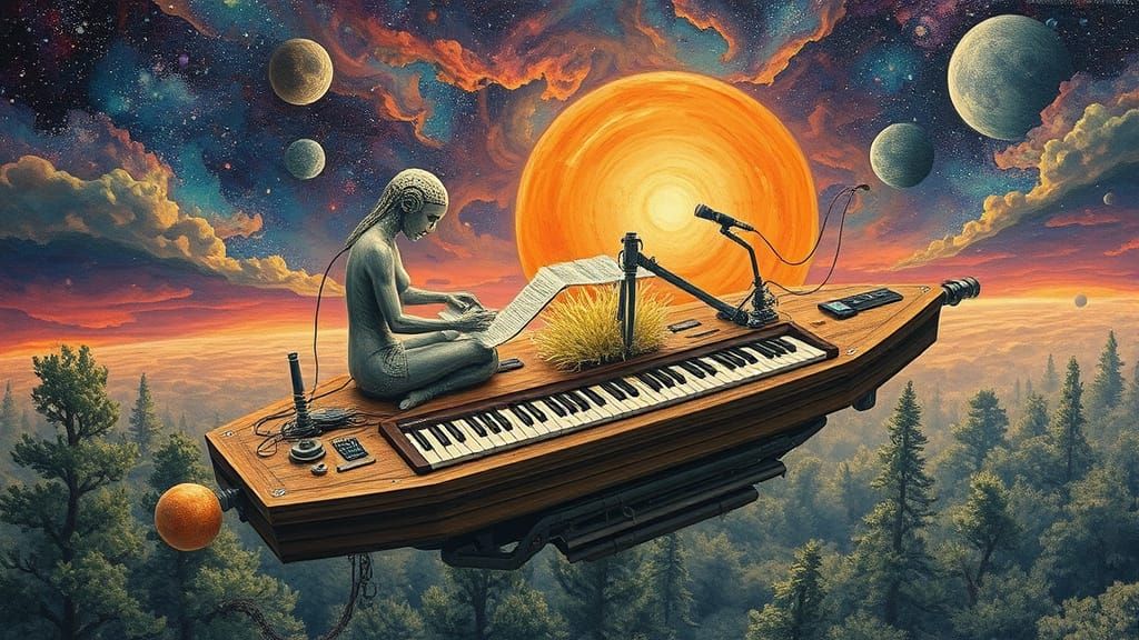 This image is a vibrant, dreamlike depiction of ethereal figures creating surreal poetry on a futuristic keyboard, set against a breathtaking sunset galaxy with a glass forest and a spaceship crafted from recycled materials. The artwork combines elements of dynamic texture and rich color, reminiscent of ...