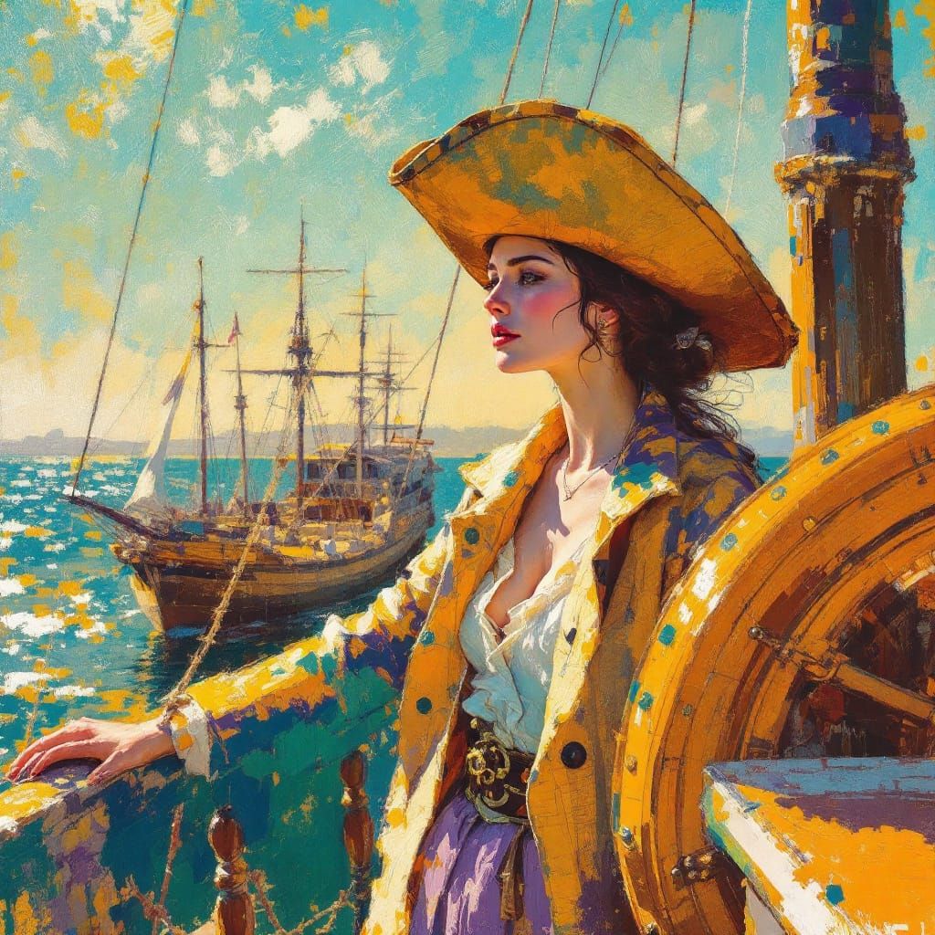 This image shows a pirate woman in a tricorne hat scanning the horizon, painted with vibrant, textured brushwork and warm color contrasts, evoking Provençal light.