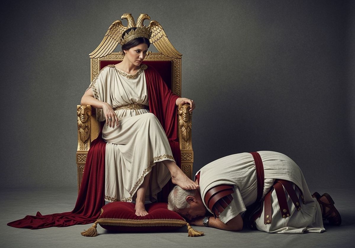 This image shows a Roman Empress on her throne, expressing displeasure towards a kneeling senator. Shot in a professional studio with natural lighting and a bokeh effect, the image captures a powerful presence.
