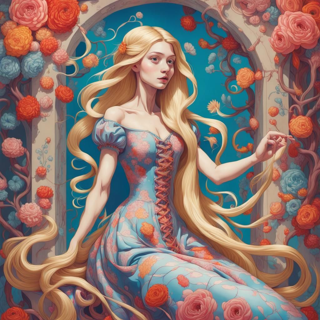 A digital painting of Rapunzel in a flowery dress. The artwork is rendered with pop surrealism elements and a colorful, dreamlike aesthetic.