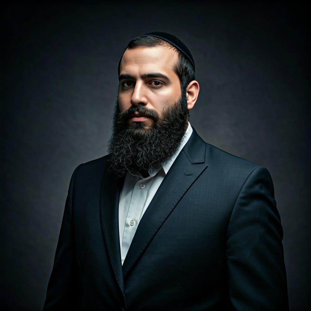 A dignified portrait of a 30-year-old Ultra-Orthodox Jewish man, dressed in a traditional black suit and white shirt, with visible tzitzit and a full black beard. The image exudes a sense of professionalism and respect, with dramatic yet naturalistic lighting emphasizing his devout and athletic qualities...