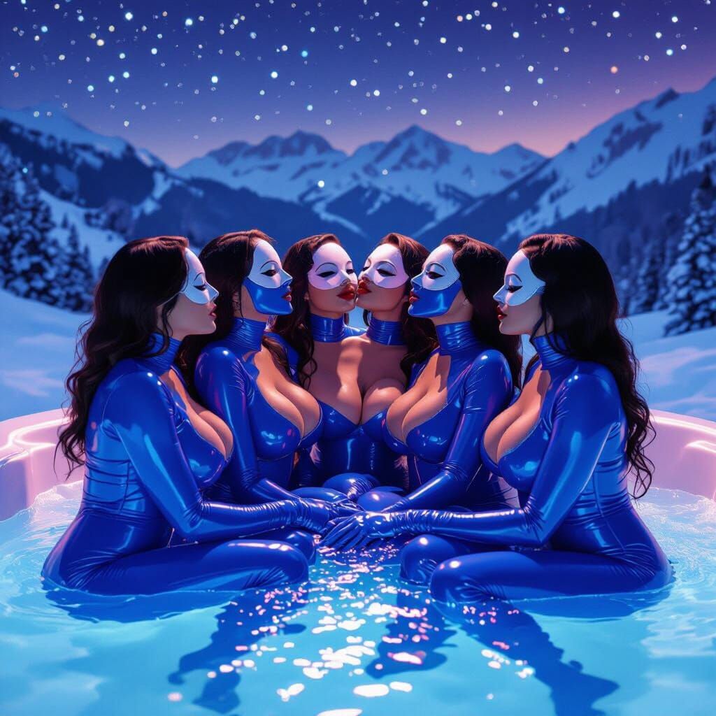 This image shows six curvy women in blue latex catsuits enjoying a steamy hot tub under a starry winter sky. The scene features vibrant neon accents and cinematic lighting, in a futuristic aesthetic.