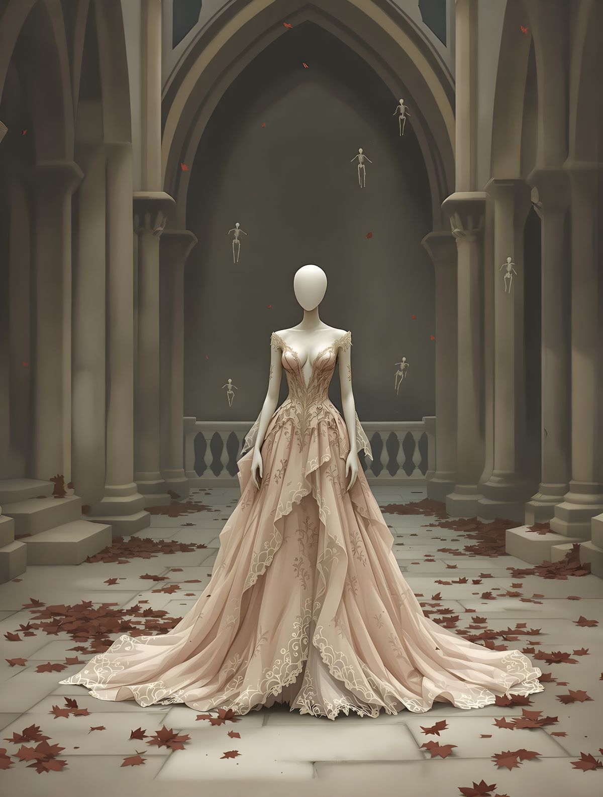 A haunting image of a pale bride in a lace wedding gown stands amidst the melancholic grandeur of a decaying gothic cathedral, surrounded by scattered autumn leaves and skeletal figures.