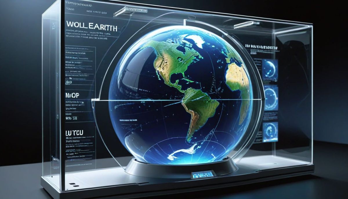 This image shows a futuristic transparent display of the Whole Earth Catalog. The display has a clean, minimalist design and suggests a technologically advanced future.