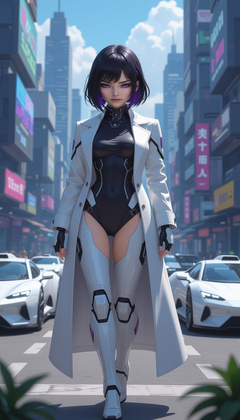 "Vella is a very beautiful female humanoid robot with short black hair streaked with purple wearing a long futuristic coat that covers a tight undershirt. Her figure is graceful, sweet and tough, she is a secret agent. The atmosphere of a futuristic city with advanced technology, super sophisticated vehicles with a semi-cyberpunk feel HD ultra 3D cartoon By artist "anime", 3d anime art, inspired by WLOP, Artstation, #genshinimpact pixiv, extremely detailed, aesthetic, concept art, ..."