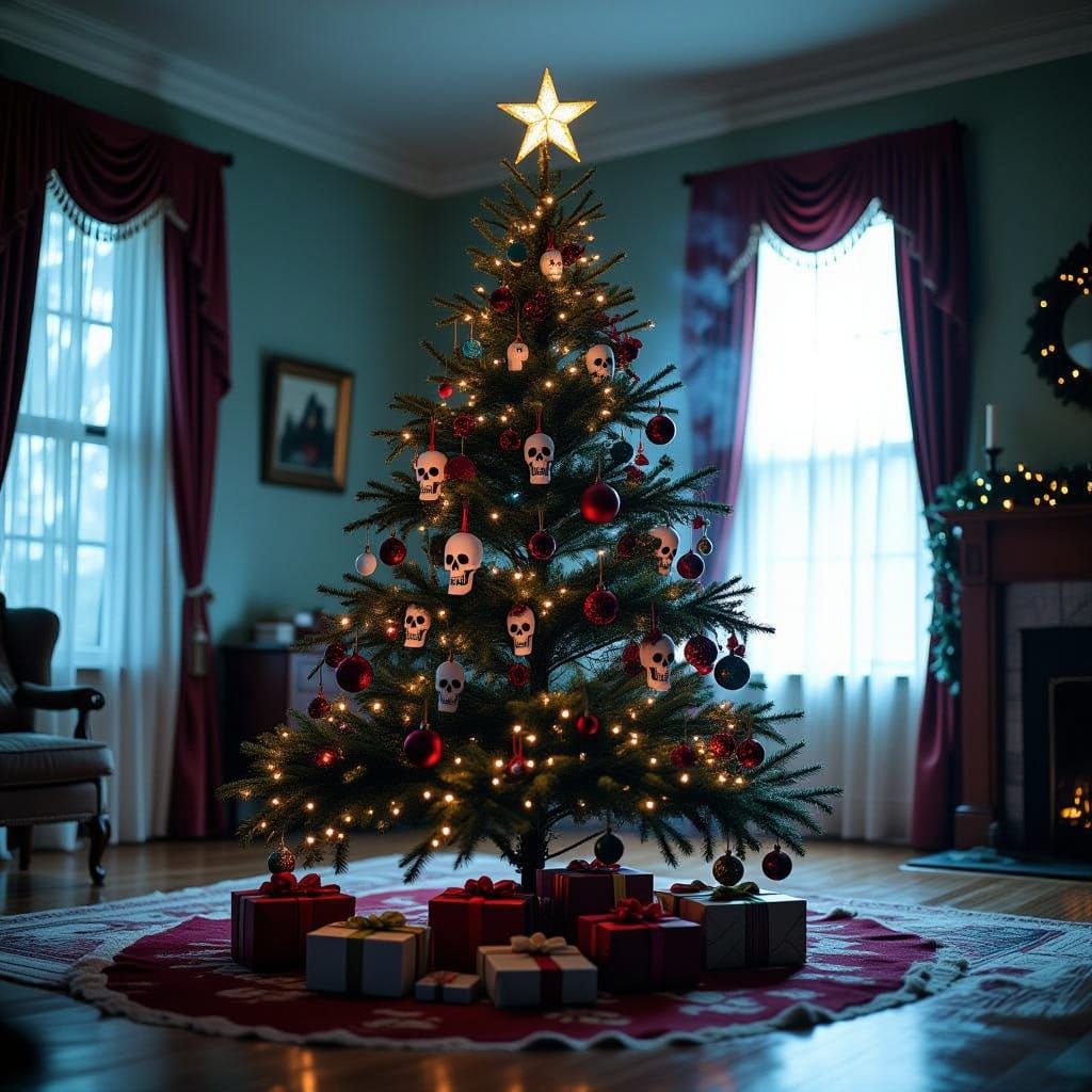 This image captures a dramatic cinematic film still of a Christmas tree adorned with eerie, haunted decorations. It features atmospheric lighting and a vintage film aesthetic.