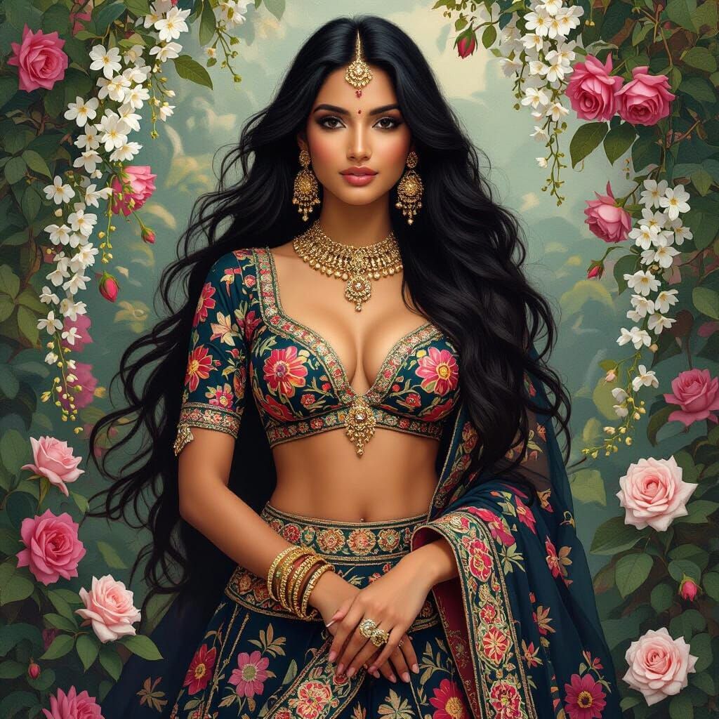 A striking picture of a beautiful Indian woman with long flowing black hair, wearing traditional attire and surrounded by flowers. The image has a classical Indian painting style.