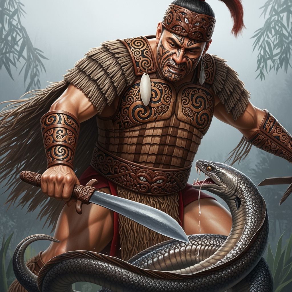 This image shows a detailed Māori warrior in carved armor adorned with traditional kuru spiral designs. The warrior strikes an eel-like serpent with a traditional weapon against a blurred New Zealand landscape. Dramatic lighting accentuates the textures.