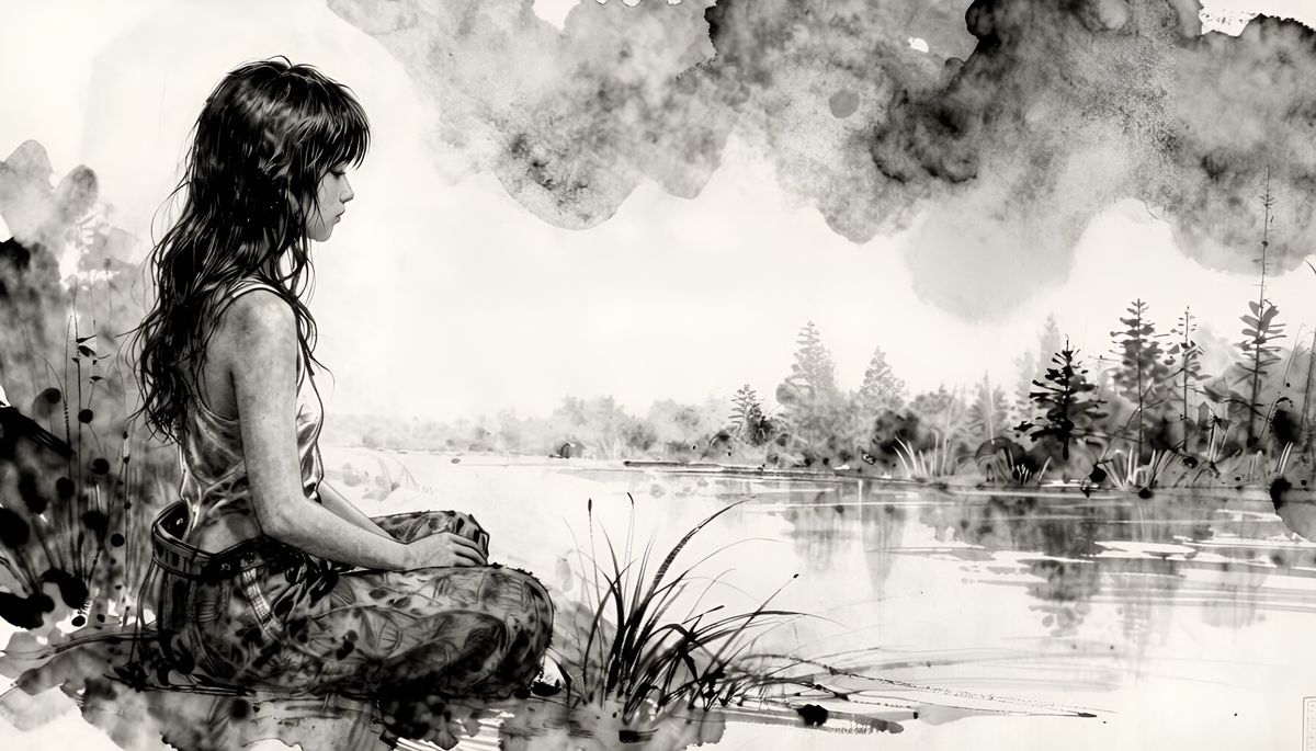 ‘The serenity in-between the moments of chaos’. Ink wash, charcoal, pastel, high detail and Digital 3D.