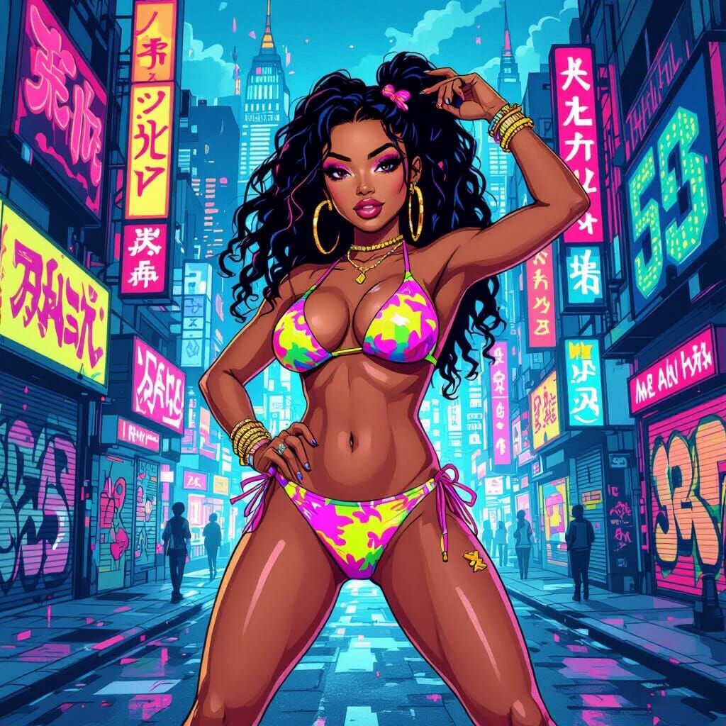 This image depicts a figure in a bikini dancing in a vibrant urban setting filled with neon lights and graffiti. The artwork features bold lines and bright colors, reminiscent of pop surrealism.