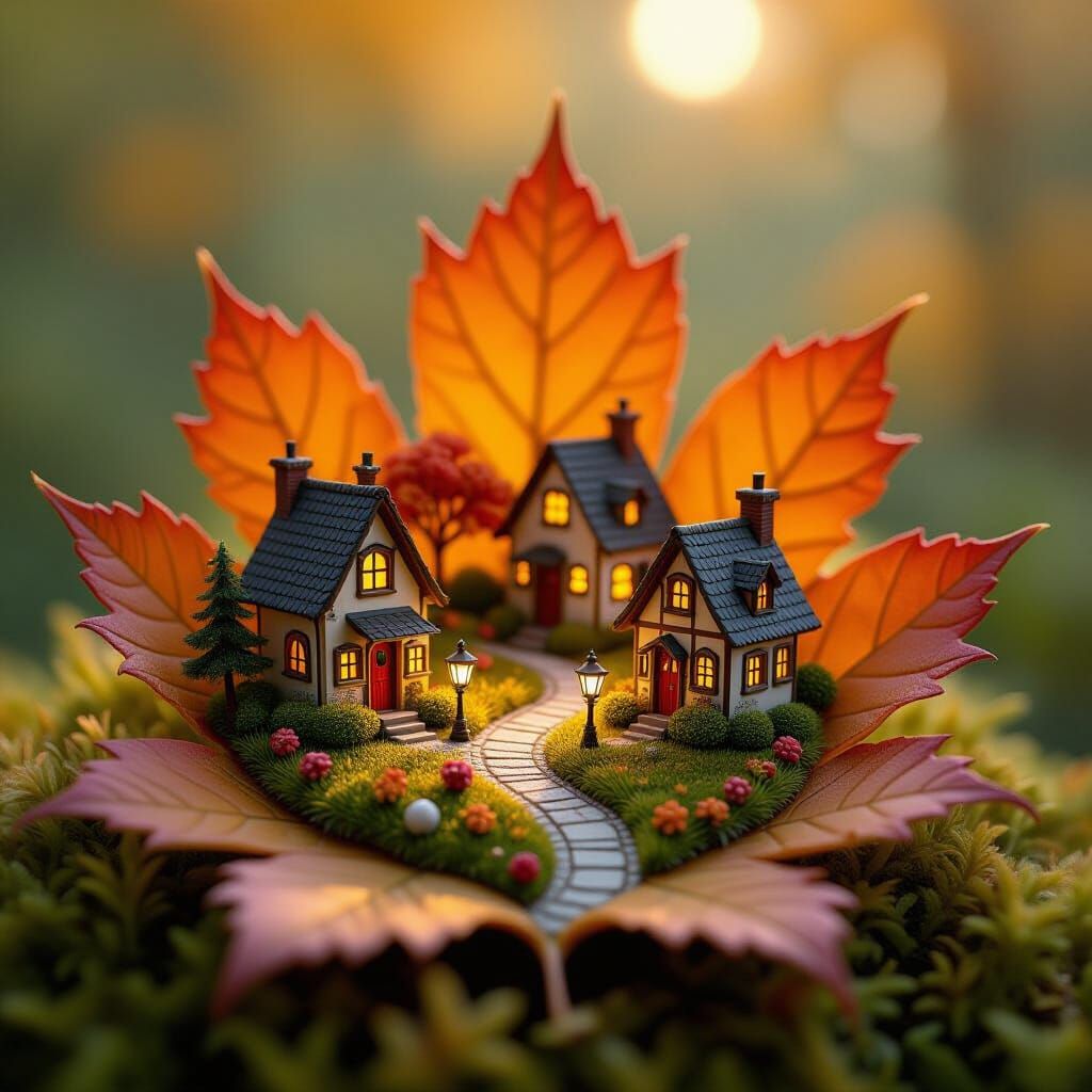 This image shows a magical miniature world of tiny houses and glowing lanterns nestled inside a vibrant autumn leaf. Captured with a whimsical, illustrative style and rich earthy tones, it evokes a sense of enchantment and cozy wonder.