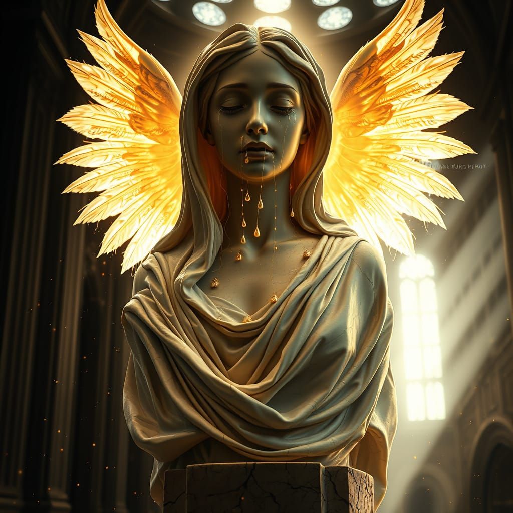 This stunning sculpture depicts a woman in a poignant, Baroque-inspired pose, surrounded by delicate drapery and radiating a divine, golden-white light. Shimmering golden tears cascade down her face, and translucent wings emerge behind her, blending into the heavenly glow.