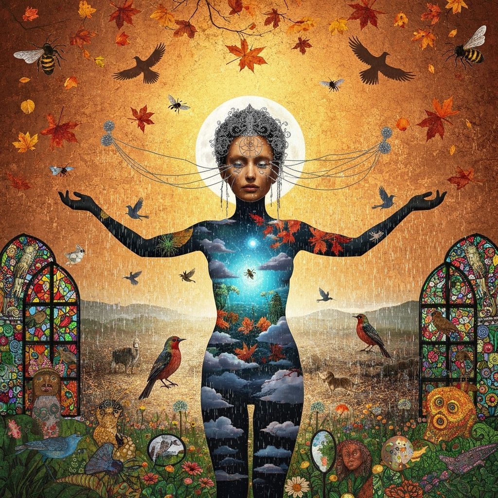 This surreal collage features a mystical shaman with translucent, bioluminescent skin revealing a frozen oasis. Autumn leaves and diverse wildlife fill the dreamlike, vivid scene under a copper sky.