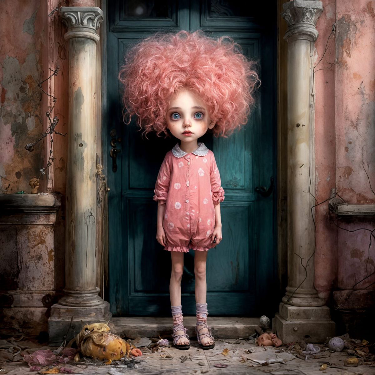 This image shows a child with messy pink hair and polka dot pajamas before an ornate door, surrounded by broken toys. It captures a surreal, gothic fairytale mood with dark, dramatic lighting.