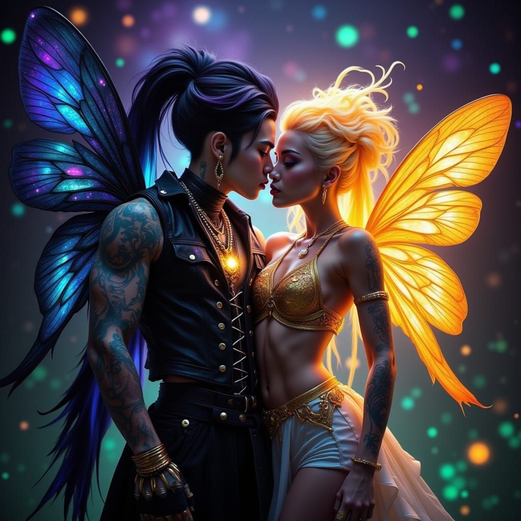 This image depicts a passionate kiss between a striking butch night fae with pale skin and celestial adornments and a radiant sunlight fae with golden eyes. The scene contrasts dark and light elements.