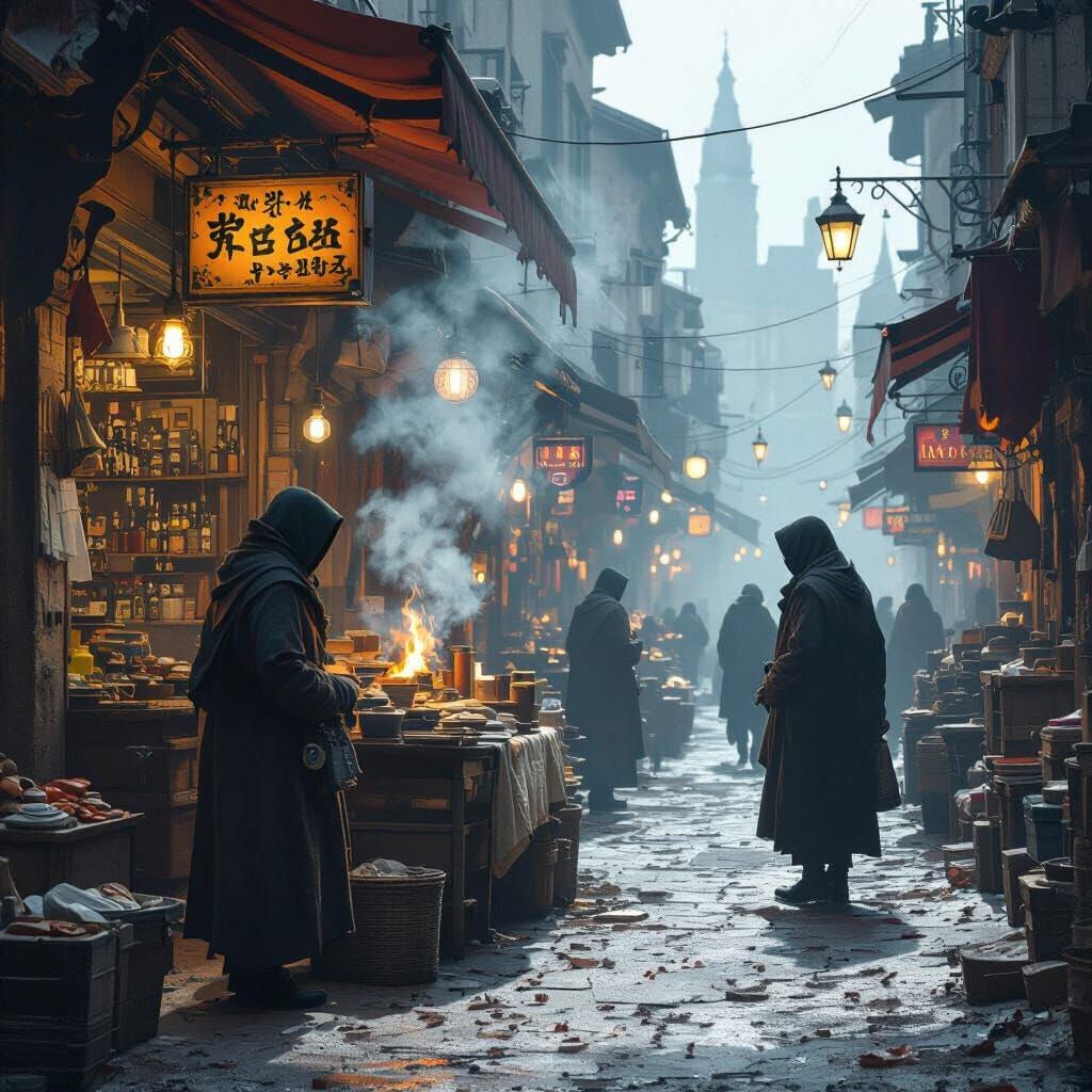 This image shows an abandoned market with smoke-covered merchants emitting sparks. The stalls are blackened, fabrics worn, and the atmosphere clandestine, rendered as detailed matte painting with complementary colors in a fantastical style.