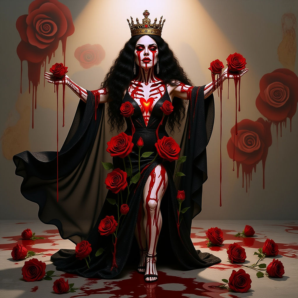 A surreal image of a woman dancing on a stage. Her transparent skin reveals her skeleton and a glowing heart. She wears a black, sparkly dress and cape, and is surrounded by roses, under a spotlight in a melting oil on canvas style.