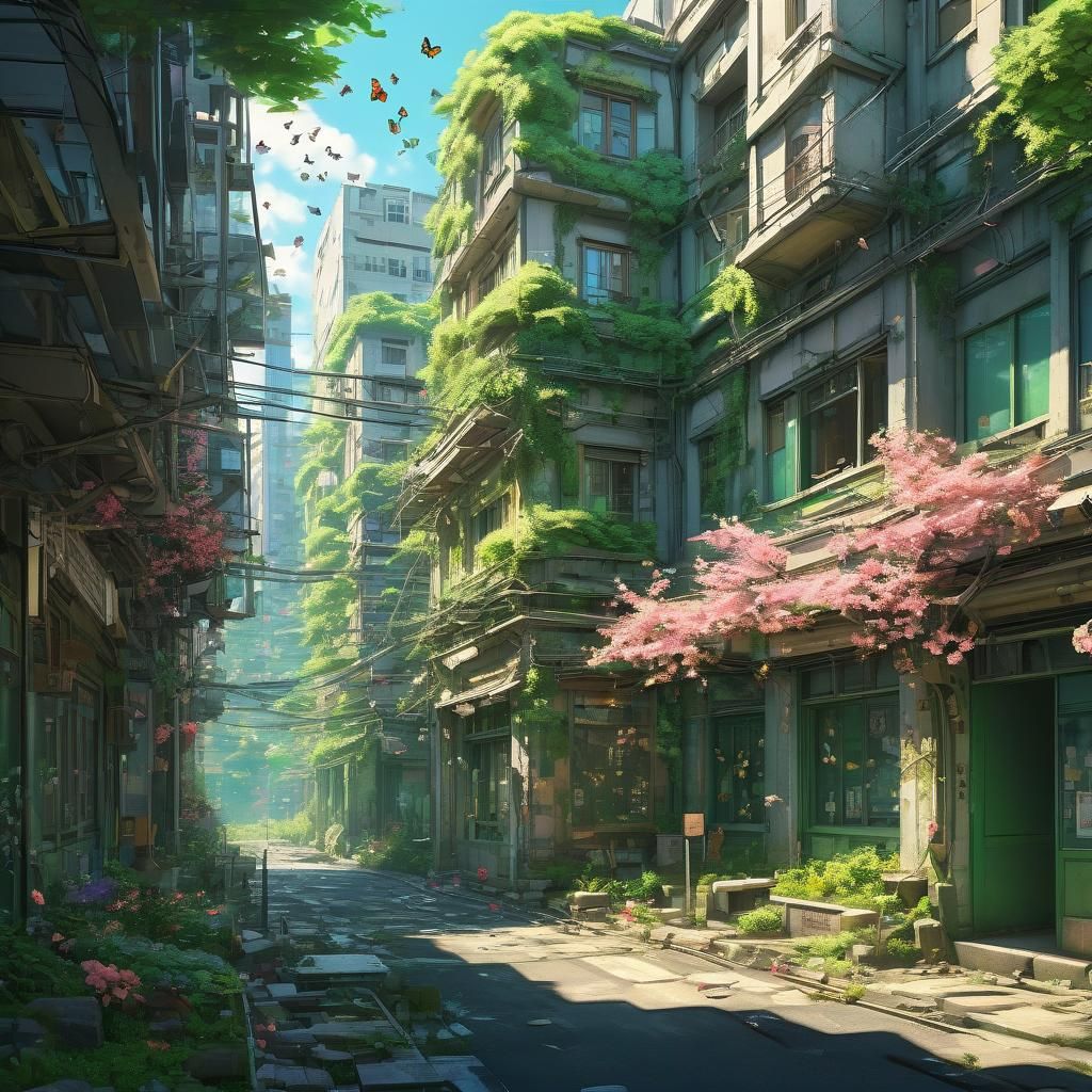 This image shows a cityscape overtaken by nature, with greenery, flowers, and trees reclaiming buildings. Butterflies and birds fly through the scene, rendered as 3D anime art in an Art Nouveau style.