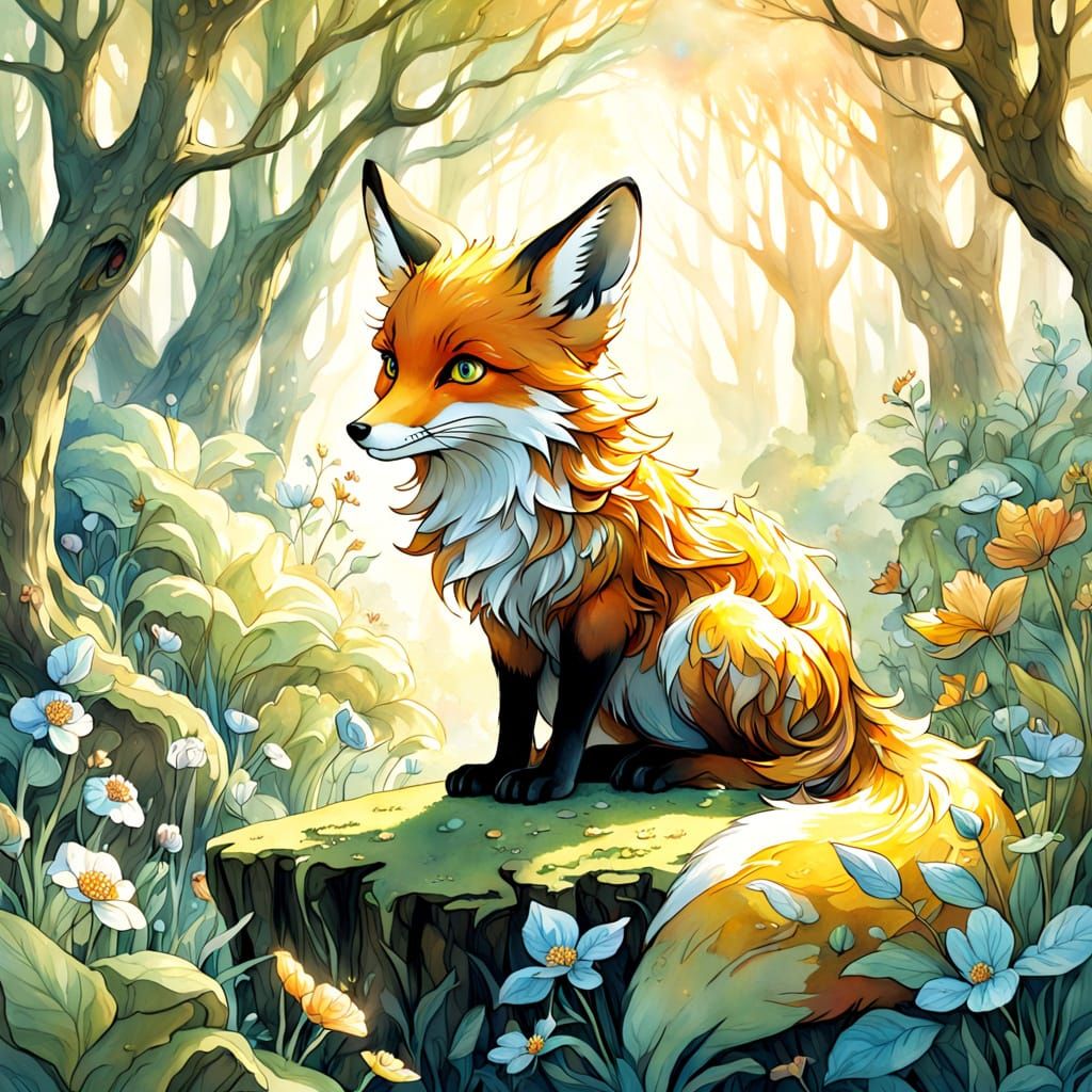 This image is a dreamy, ethereal watercolor sketch of a fantastic fantasy fox sitting in a lush, vibrant forest. Inspired by the styles of Beatrix Potter and Arthur Rackham, the artwork features soft, feathery brushstrokes and delicate patterns in shimmering, iridescent colors with warm, golden lighting ...