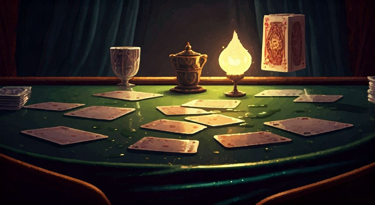 This image shows a magical scene of playing cards on a velvet poker table, rendered with a wet-on-wet watercolor style with a shimmering, glossy finish.