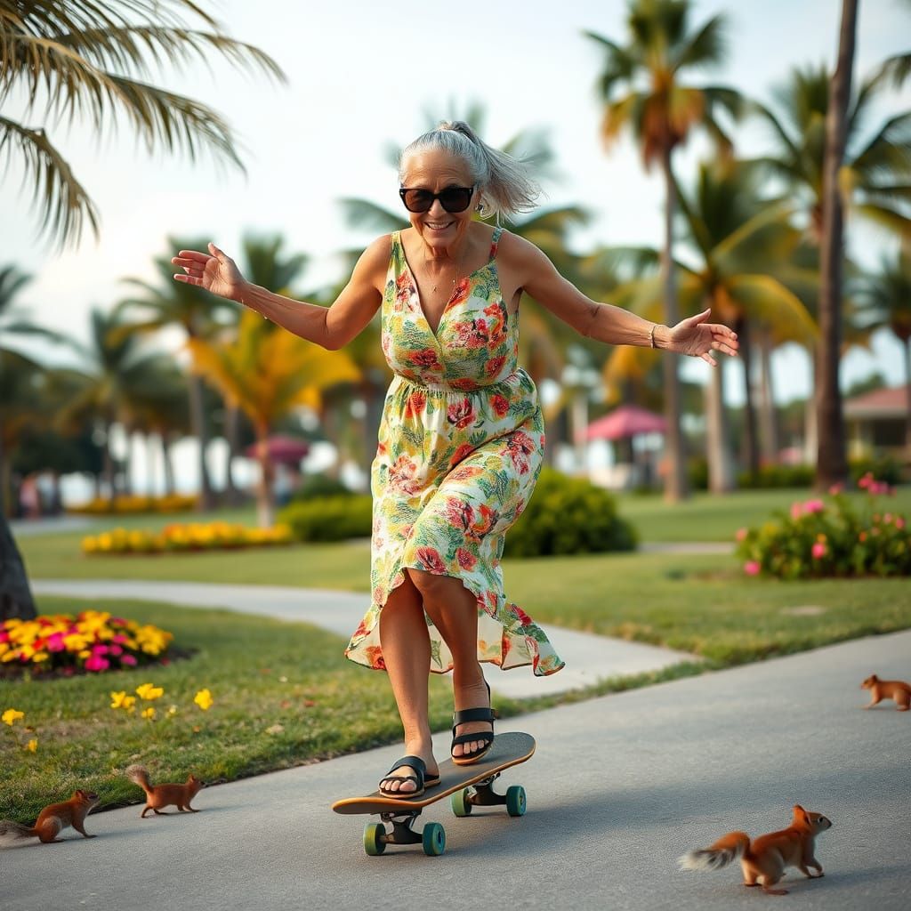 This image shows an elderly woman skateboarding through a vibrant beach park. She wears a floral dress and sunglasses, performing an ollie with a smile. The scene is captured with natural lighting and a shallow depth of field.