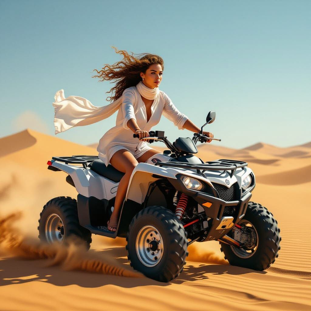 This image shows a woman riding a quad bike across the Sahara Desert. She has bronzed skin and wears a flowing white shirt. The scene evokes futuristic realism.