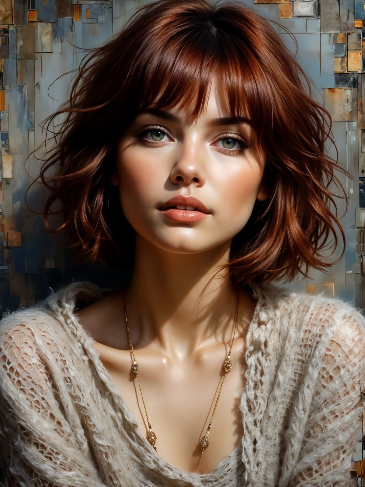 3/4 angle shot. A young Lady, bobbed dark auburn hair with bangs, realistic skin tones with pores and other imperfections, wearing a plunging neckline fuzzy sweater. Beaded necklace. Mosaic background