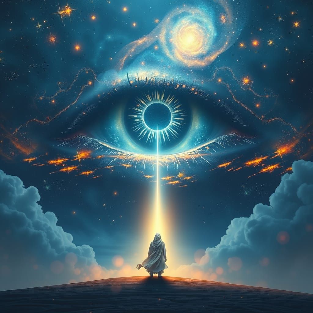 This image shows a solitary figure in white robes beneath a giant cosmic eye. The eye is formed of galaxies and nebulae in a surreal, shimmering landscape with gold accents, reminiscent of digital artwork.