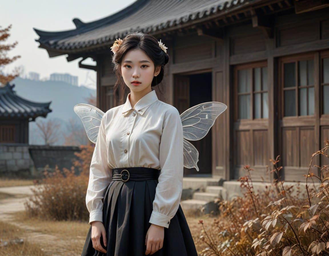 This image shows a surreal artwork blending social realism with fairy punk elements. It features Stalinist architecture, Joseonhwa art styles, and a mix of dark, melancholic aesthetics.