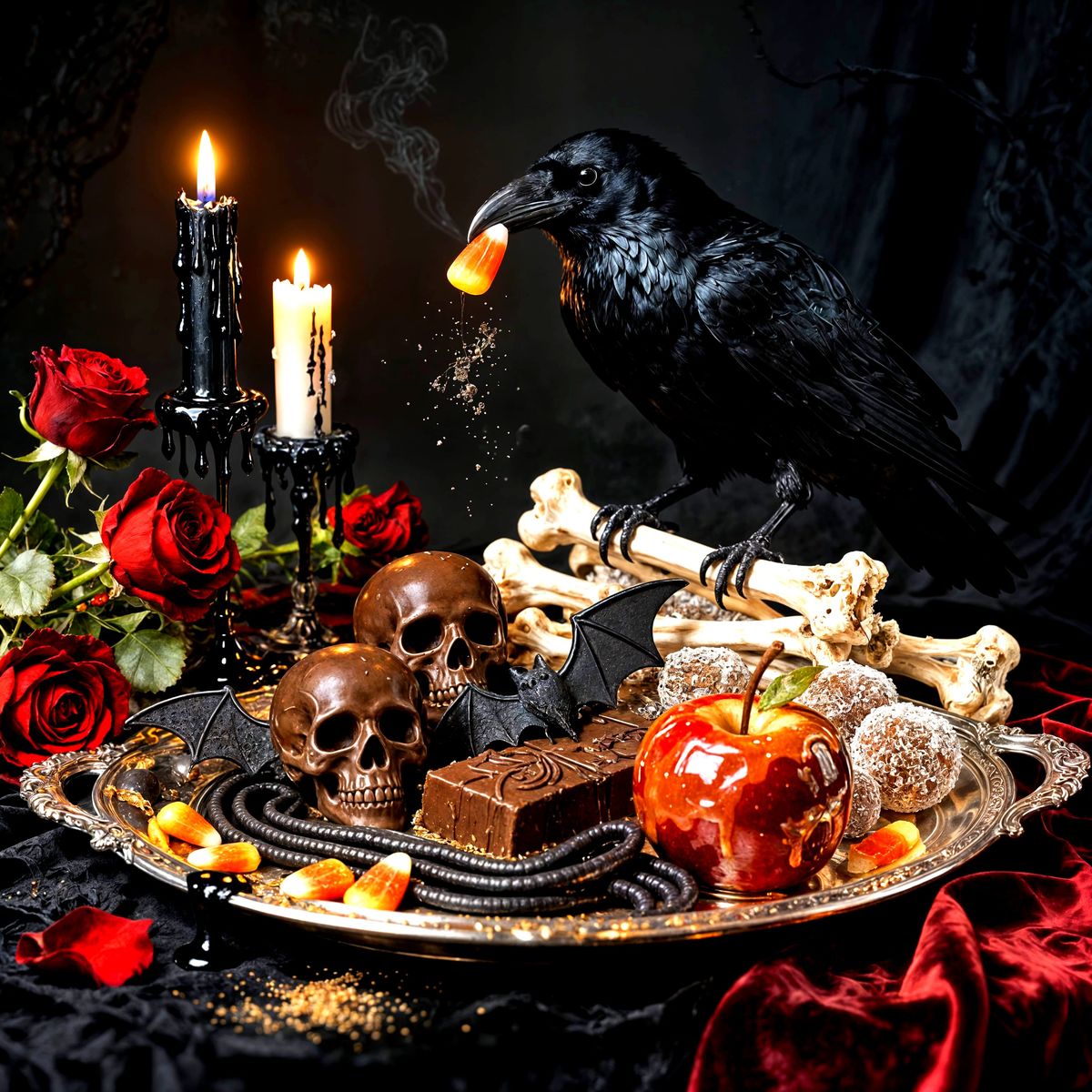 A dark, gothic still life featuring a silver platter laden with Halloween sweets, melting candles, wilting roses, and a raven perched on sugared bones.
