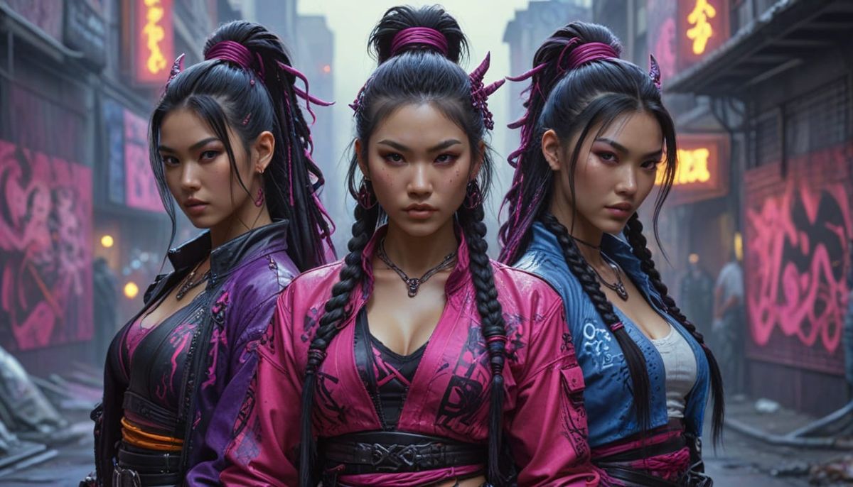 A striking picture of three Asian demon hunters in graffiti-covered cyberpunk attire. The digital art features intricate braids with purple and pink highlights, dramatic backlighting, and a hyperrealistic, cinematic aesthetic in 8k resolution.